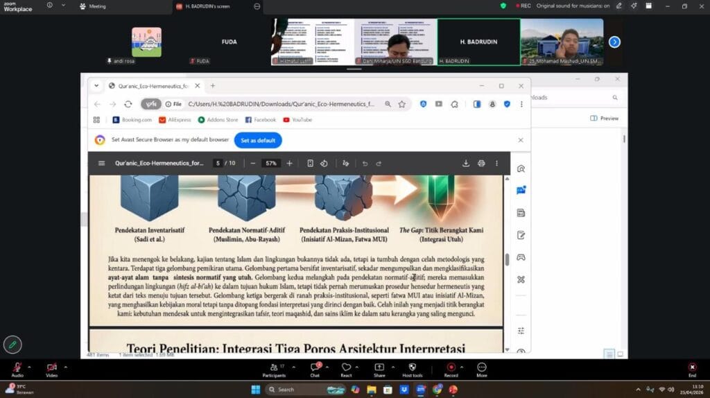 Seminar ini dilaksanakan secara intensif dalam dua sesi utama. Sesi pertama berlangsung pada Kamis, 23 April 2026, yang dipandu oleh Rika Leli, M.A. sebagai moderator. Fokus pemaparan pada sesi ini mencakup rumpun Pemikiran dan Filsafat Islam, Tafsir dan Hadis, Sejarah Islam, serta program Pengabdian Kolaborasi. Diskusi berjalan dinamis dengan kehadiran Prof. Dr. Ahmad Atabik, Lc., M.Si. dan Dr. Anton Widyanto sebagai reviewer yang banyak memberikan sorotan pada penguatan metodologi dan orisinalitas gagasan agar penelitian memiliki daya saing yang kuat.